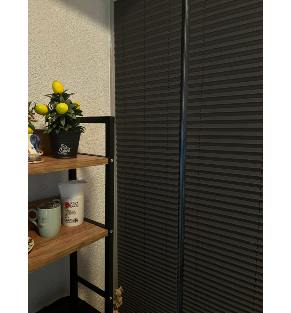 Siyah renkli dimout özellikli plise perde, modern iç mekânlarda hem dekoratif hem de fonksiyonel bir çözüm sunar. Dimout kumaş yapısı sayesinde dışarıdan gelen ışığı %60’a kadar azaltır ve odalarda daha kontrollü bir atmosfer oluşturur. Özellikle ev sinema odaları, çalışma alanları ve yatak odaları için mükemmel bir ışık yönetimi sağlar.